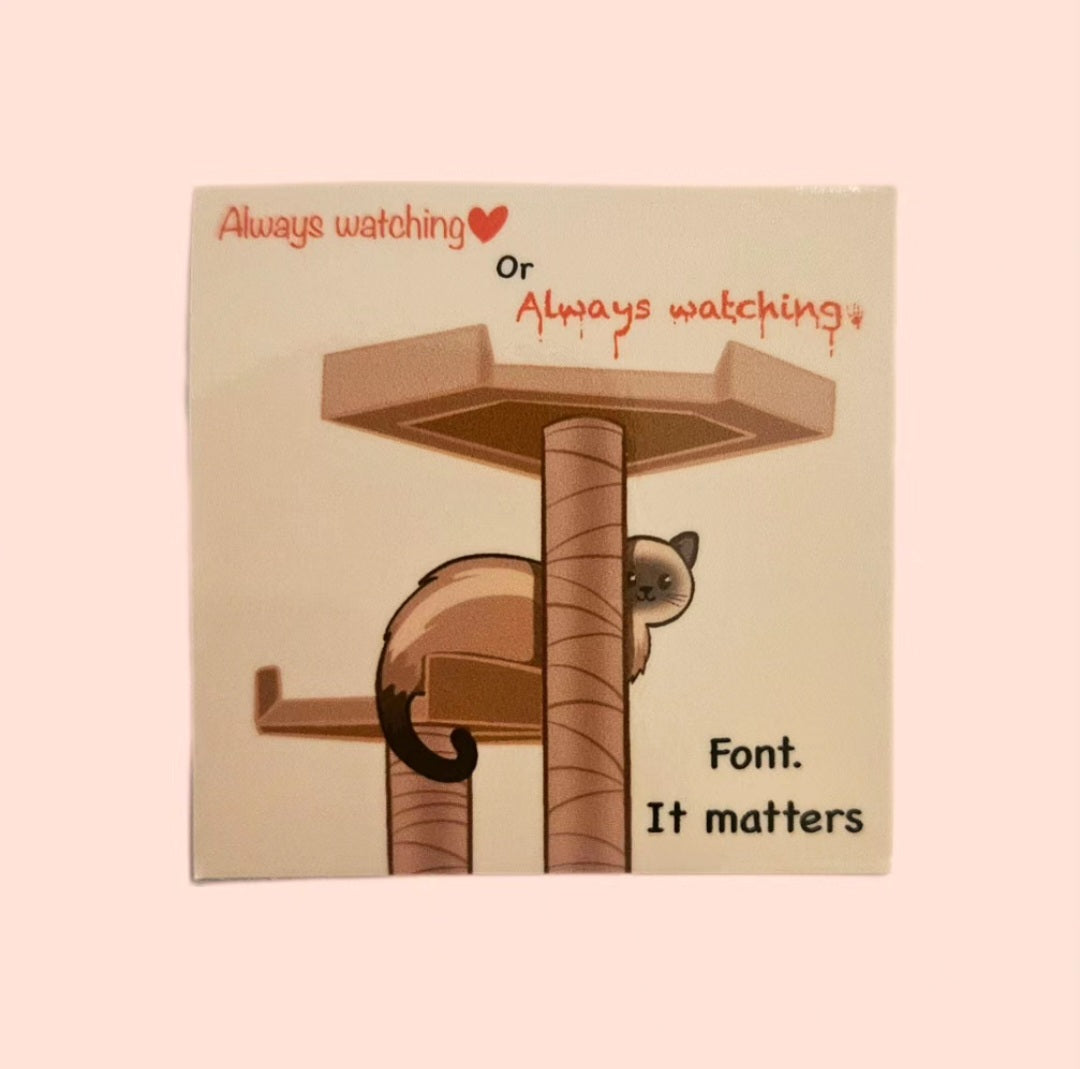 Always watching font matters cat sticker. Bento is always looking at you. Glossy finish sticker. 2inches x 2 inches big.