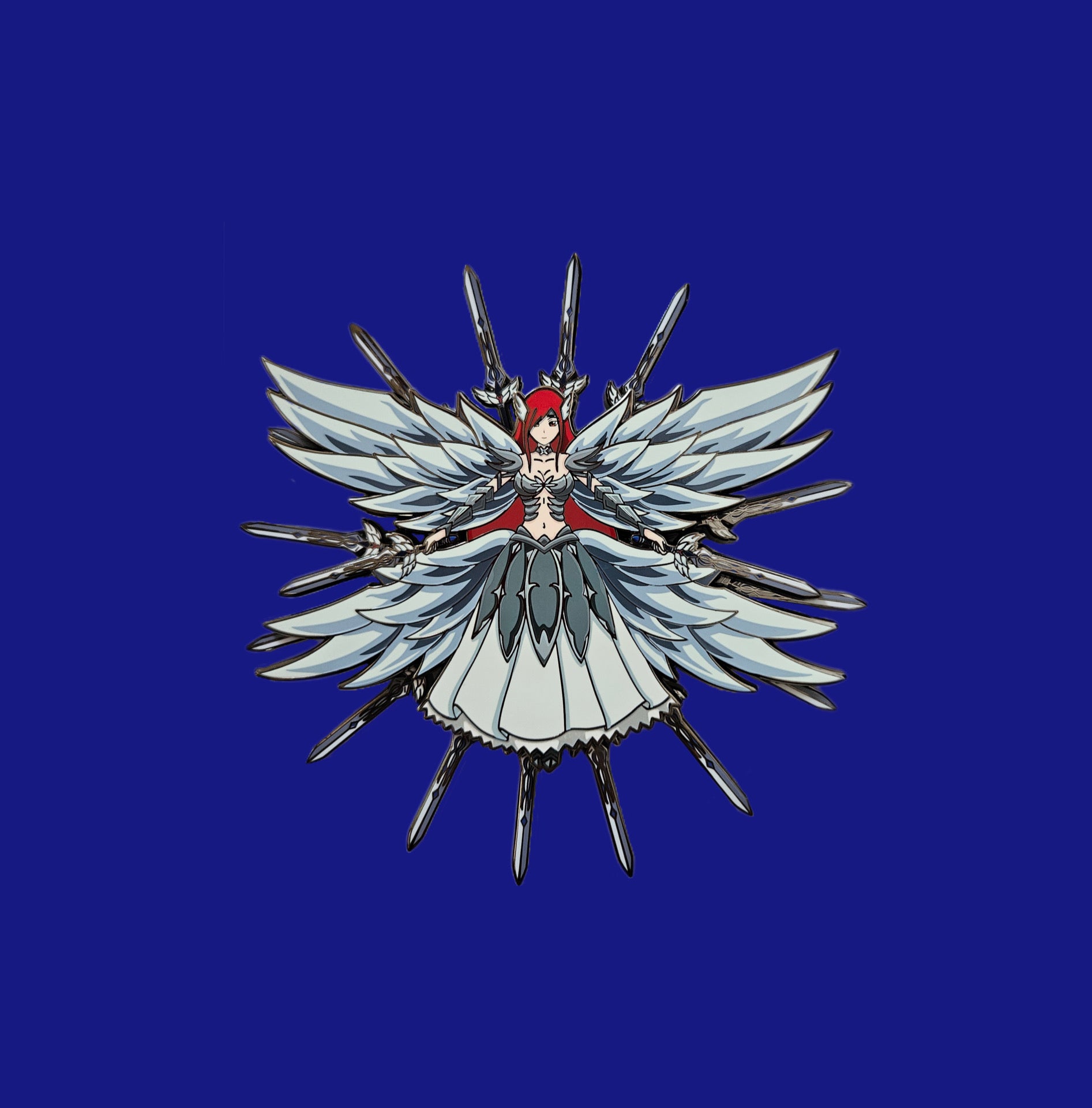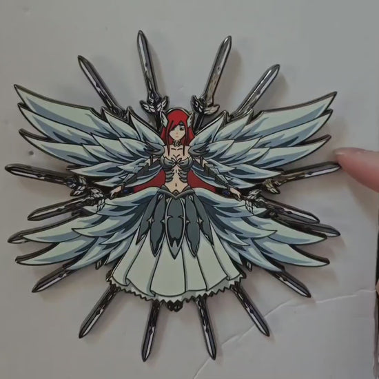 Erza scarlet in heavens wheel armor with swords spinning behind her. 3 layer pin with Erza on top, swords spinning in the middle, and the pin base. 2 layers visible. Black nickel plating with 3 rubber backing clutches. Size is 4.5 inches large.