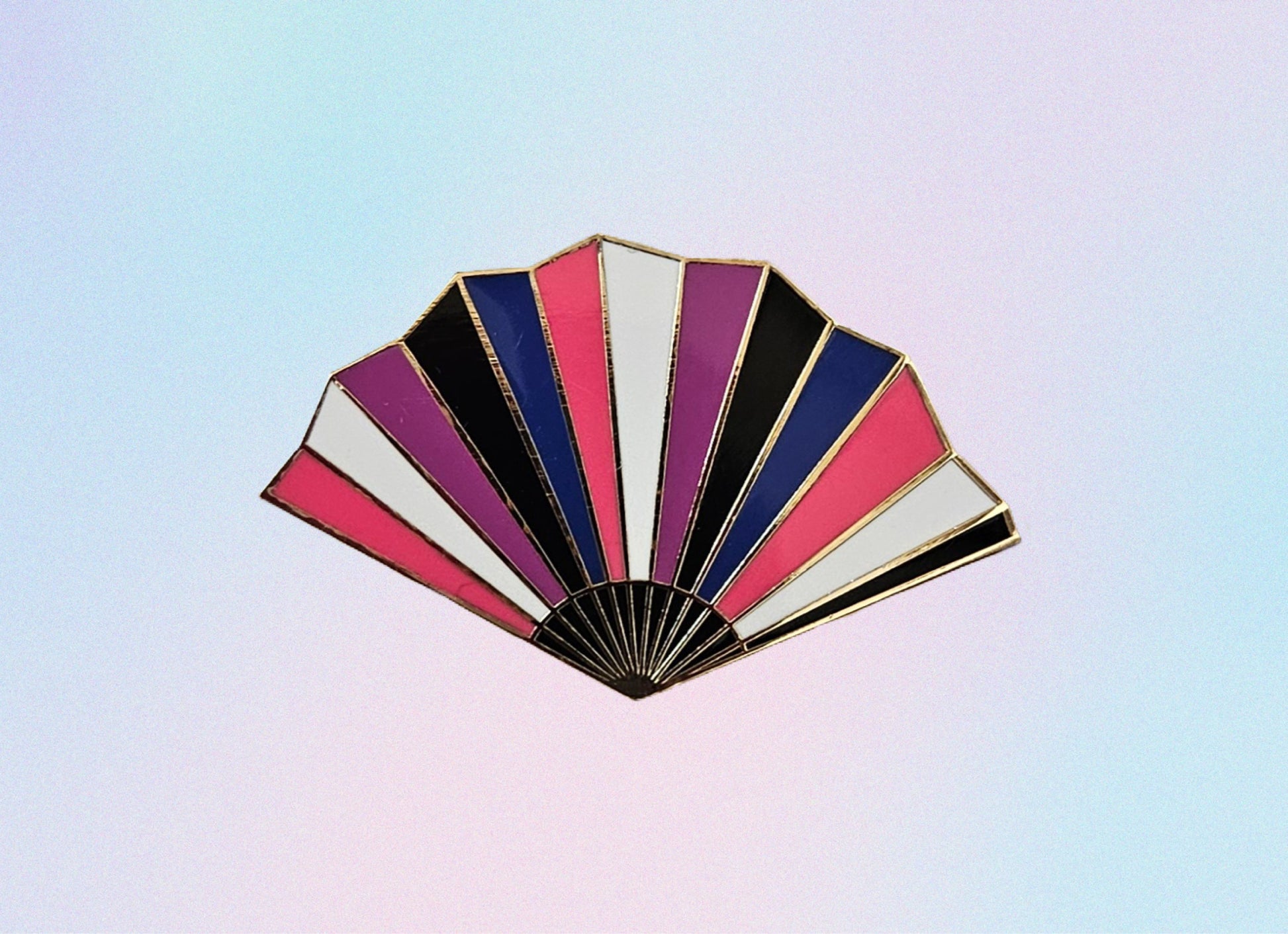 Genderfluid pride fan filler enamel pin. Gold plating with rubber backing clutch. Size 1.35in