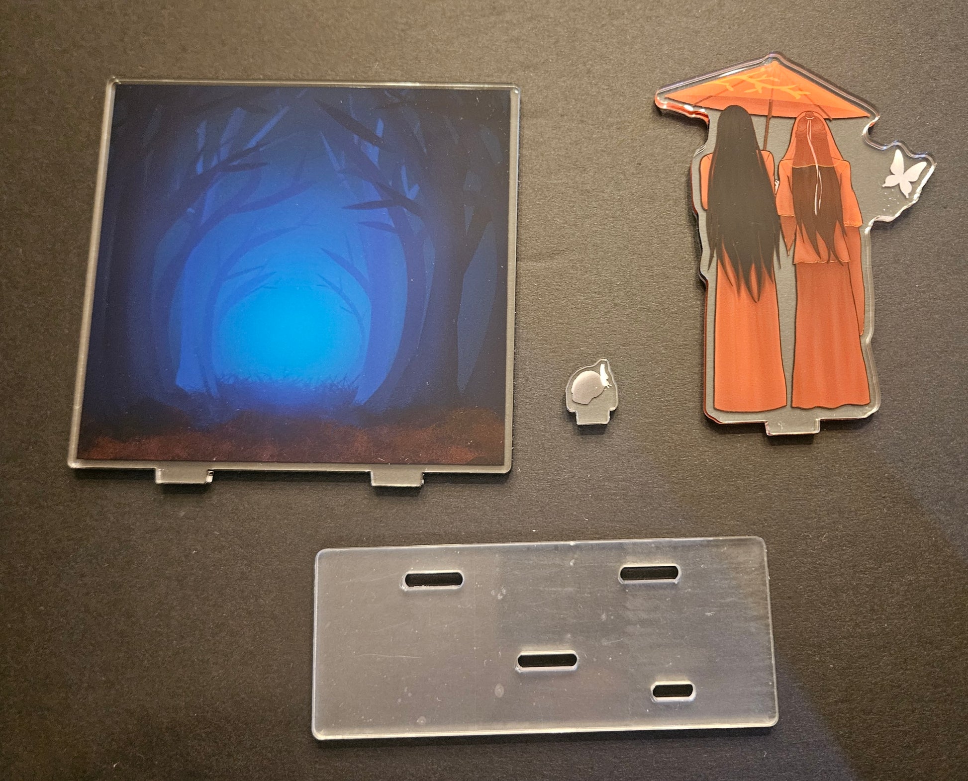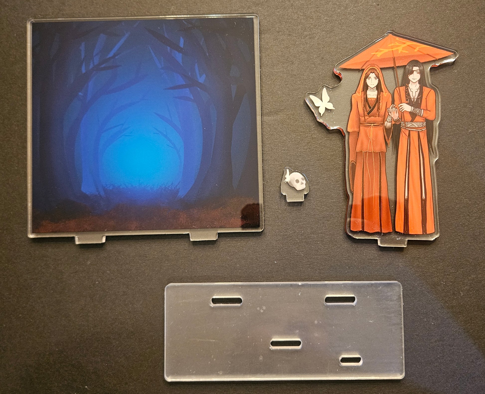 Hualian acrylic stand. Hua cheng walks bride Xie lian through the forest. 4 pieces: 1 base, 1 background, 1 hualian figure, 1 skull figure. The color is a bit orange in the picture because I was trying to photograph without reflection. See slide 2 for more accurate color. It is more red than orange in real life. Size: background-5inx4.75in, hualian figure-4.5inx3.5in, skull-.75inx.60in, base- 5inx2in. Double sided print. Clear base.